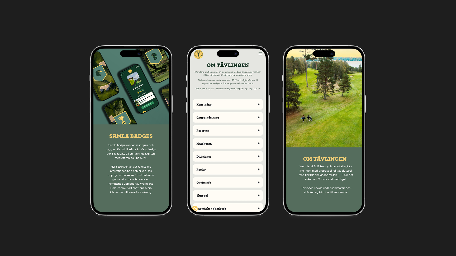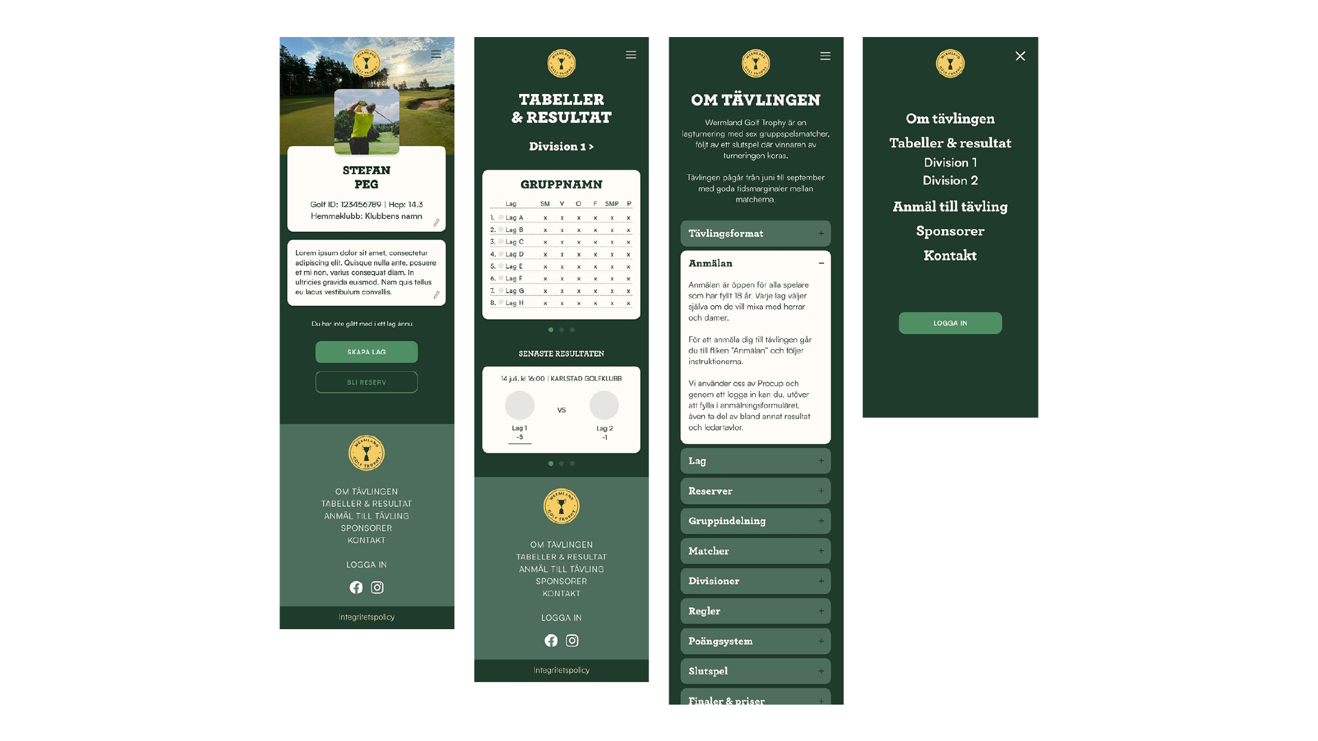 Lösningen blev en visuell och funktionell plattform som inte bara hanterar tävlingen, utan också stärker upplevelsen runt den. I nära samarbete med Infid, som ansvarade för den tekniska utvecklingen, tog vi fram koncept, design och användarupplevelse. Det visuella uttrycket hämtar sin inspiration från golfens material och miljöer, från den beige tonen i golfhandskens läder till den gröna fairwayen där färgerna dessutom namngavs efter golftermer för att skapa ett sammanhållet och målgruppsnära språk.